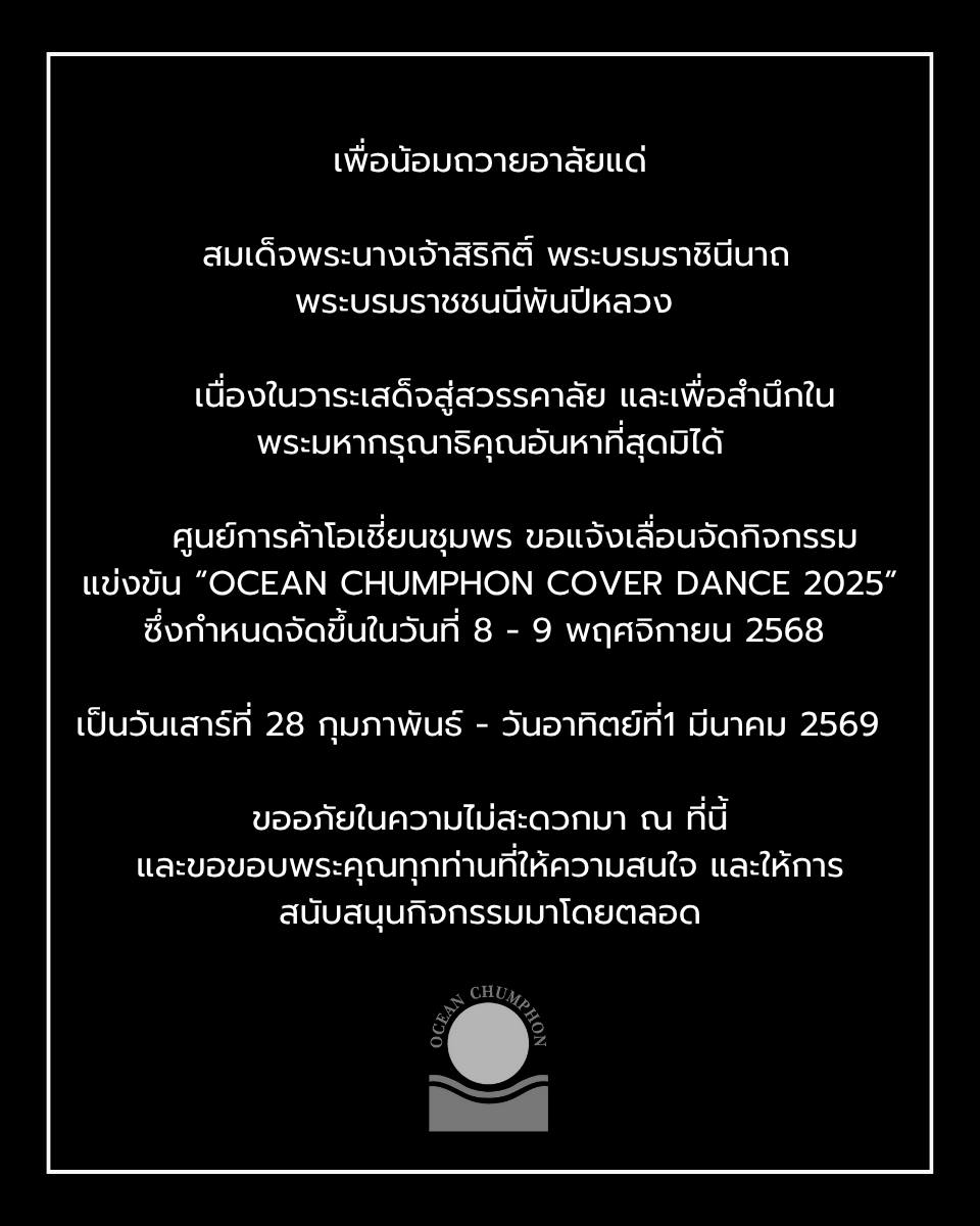ศูนย์การค้าโอเชี่ยนชุมพร ขอแจ้งเลื่อนจัดกิจกรรม แข่งขัน “OCEAN CHUMPHON COVER DANCE 2025”