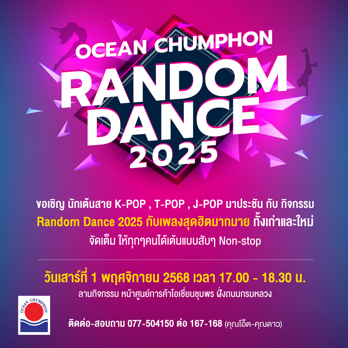 กิจกรรม OCEAN CHUMPHON RANDOM DANCE 2025 วันเสาร์ที่ 1 พฤศจิกายน 2568 เวลา 17:00 น. - 18.30 น. ลานกิจกรรม หน้าศูนย์การค้าโอเชี่ยนชุมพร ฝั่งถนนกรมหลวง